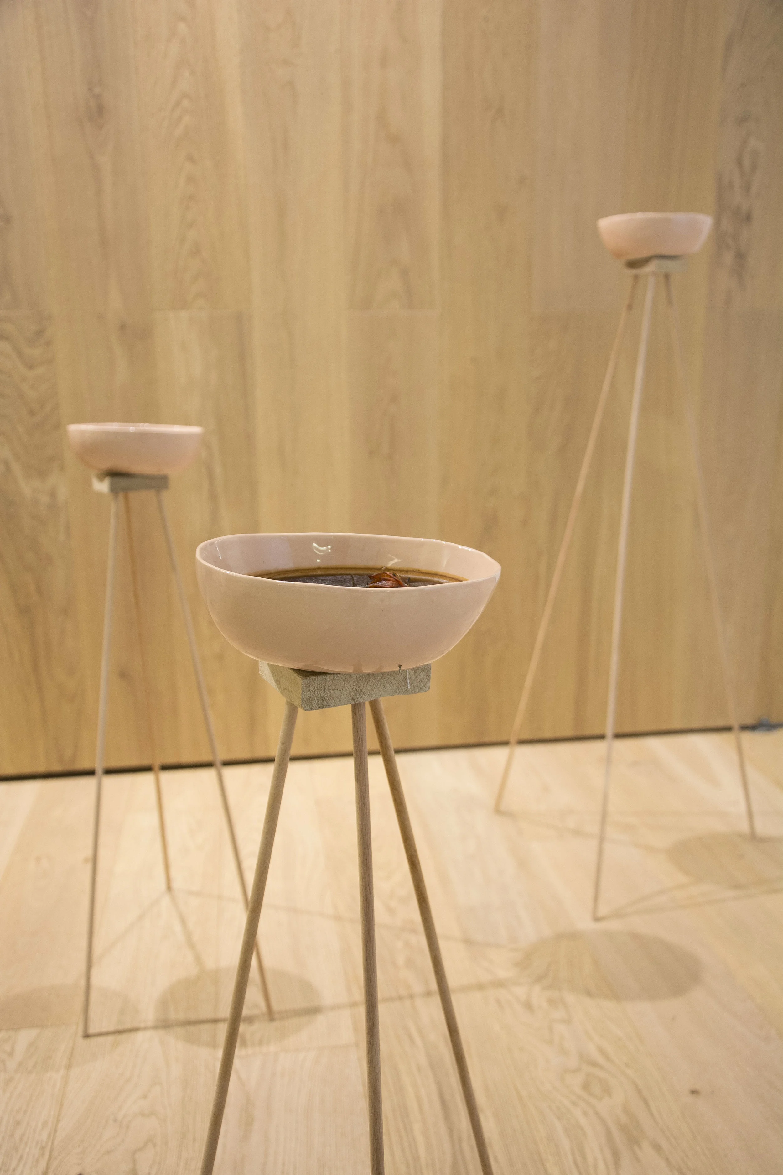 Ces bols sont liés à un rituel ancestral aux racines sud américaines et asiatiques, que l’on appelle ‘vagina steaming’. Ce rituel invite à plonger des plantes médicinales dans l’eau bouillante dans un récipient. La vapeur obtenue détient des propriétés curatives pour les problèmes liés au cycle de la femme, à la fertilité ou à des douleurs intérieures ou traumatismes vaginaux. En étant à la fois des pièces usuelles et des objets-symboles, ces récipients fragiles deviennent alors des invitations à être remplies. Les céramiques, en installation, sont placées sur des totems à différentes hauteurs symboliques, parfaites à l’absorption de la vapeur chez chaque femme.